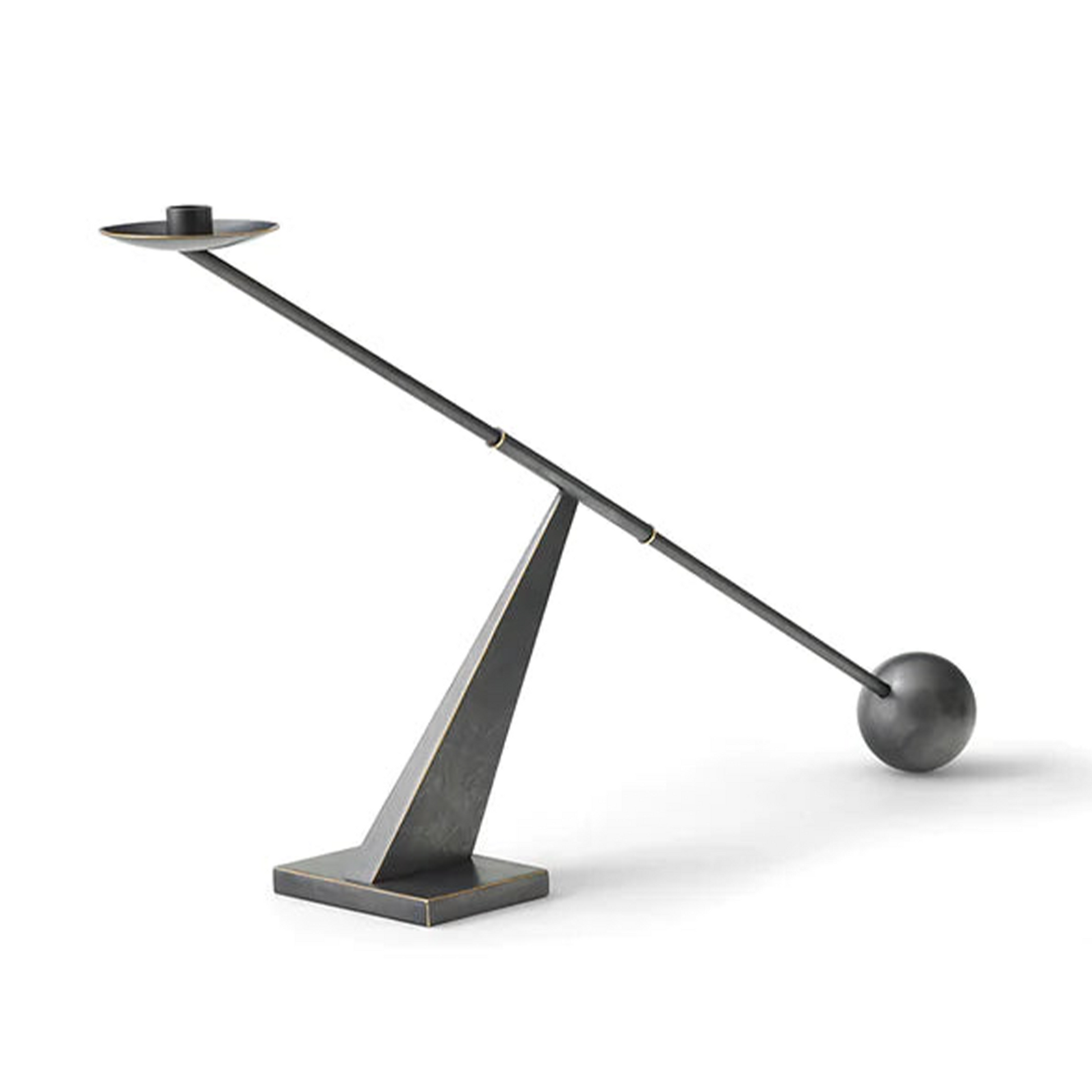 Interconnect Candle Holder is a bold and illuminating centrepiece of exaggerated proportions, designed for Audo by Colin King. As a source of cosy candlelight, it is characterised by its deceptively simple geometric form: a sphere, an angle and a line, which unite to create a unique design. Available in polished brass, bronzed brass or painted steel, it goes beyond its intended use to function as a sculpture.